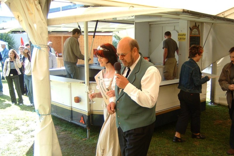 << < > >> Parkfest 2004 Bildbeschreibung: Unser Präsident mit der neuen Weinprinzessin Marika Böhme Bilderkategorie: Park- und Weinfest