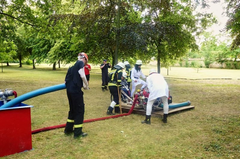 << < > >> Park- und Weinfest 2016 Bildbeschreibung: Showeinlage der Feuerwehr mit ihrer "Behinderten" Staffel Bilderkategorie: